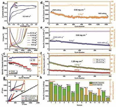 (h)不同Si負極的性能比較圖。