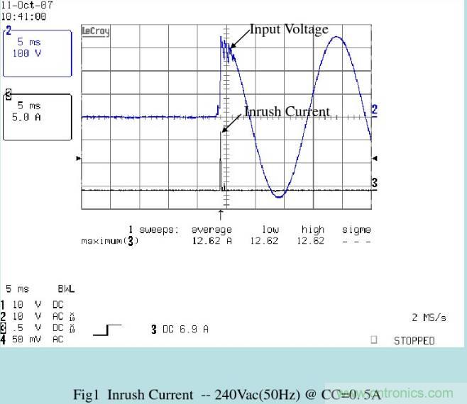 測試S.M.P.S. 輸入浪涌電流INRUSH CURRENT, 是否符合SPEC.要求.