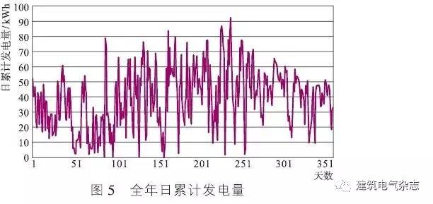 每日累計(jì)的總發(fā)電量如圖5所示(DeST氣象參數(shù)為歷年典型氣象參數(shù),考慮了陰天等氣象的隨機(jī)變化,故存在日累計(jì)發(fā)電量突降的情況)。日累計(jì)發(fā)電量最大為92. 5 kWh。