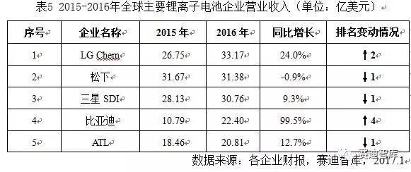 2016年全球充電機充電鋰離子電池產業企業格局較2015年發生了明顯變化。LG Chem憑借24%的增速躍居至全球首位,首次超過松下、三星,主要原因在于其動力充電機充電電池被各大電動汽車領域廣泛采用;松下下滑至第二,2016財年充電機充電鋰離子電池業務收入較2015財年小幅下滑,主要在于消費類產品需求下降而動力充電機充電電池大客戶特斯拉增幅有限;三星SDI降至全球第三,受Note 7爆炸事件影響2016年增速出現了明顯下滑。比亞迪憑借將近100%的增速一舉超過包括ATL、索尼等在內的企業躍升全球第四,ATL位居第五,兩者差距十分微小,但比亞迪和ATL與全球前三的差距較大。